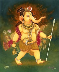 Sri Simha’s abiding interest in Scriptural Art has during the years 2000-2014 resulted in several series on Vedic and Epic themes, made possible by the sustained support extended by Ramsons Kala Pratishthana of Mysore. Sri R G Singh, Secretary of Ramsons Kala Pratishthana, and Sri M B Singh, Advisor to the Pratishthana, are widely known for their connoisseurship and their readiness in promoting and nourishing traditional painting and sculpture. Encouraged by the support from the Pratishthana, Sri Simha produced a series of paintings visually interpreting the verses of Śrīsūkta of the Ṛgveda in 2001. The series won wide acclaim and paved the way for similar interpretative series on Vedic and Epic lore such as Puruśasūkta, Vāgambhraṇīsūkta, Rudrādhyāya, Gaṇeśapurāṇa, Kālikāpurāṇa, and two series on Tantraśāstra. In addition to these eight series (2001-2013), Sri Simha has also created over fifty stray paintings, many of them being depictions of different deities as described in the Āgamas.