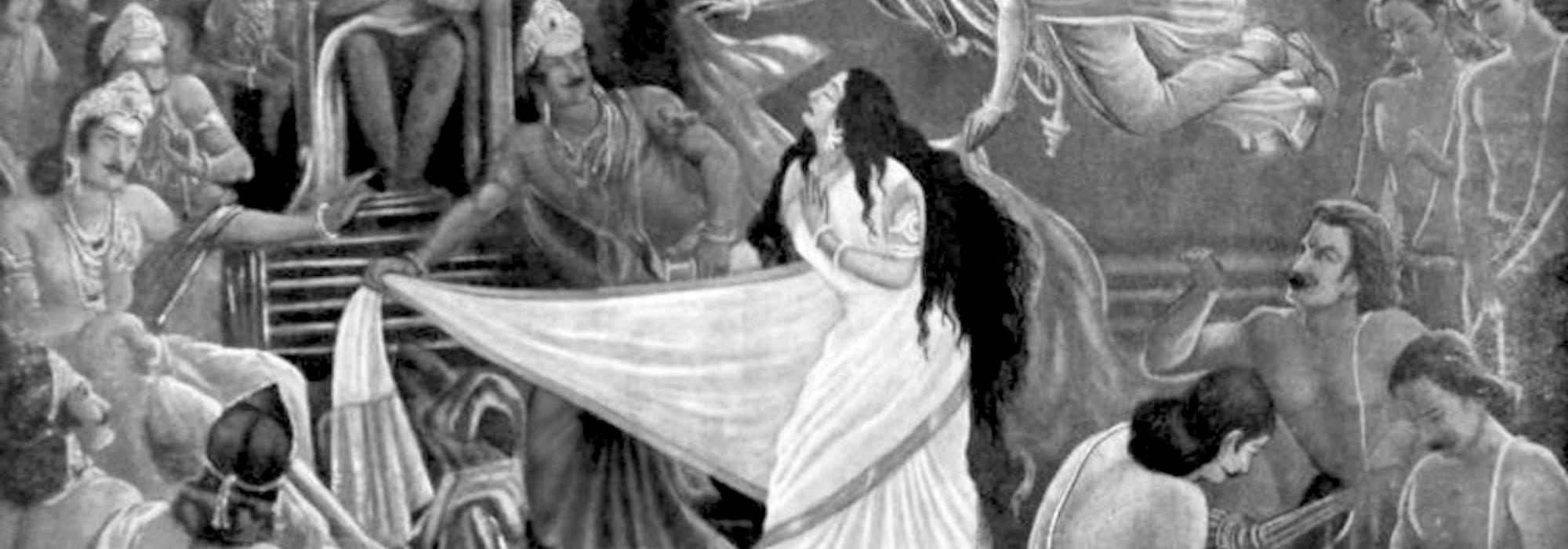 The gambling match has finished. Dharmaraya has lost. All his four brothers have accepted defeat. A menstruating Draupadi has been summoned to the hall. Dusshyasana has attempted to disrobe her. Finding no other help, she has invoked Sri Krishna.