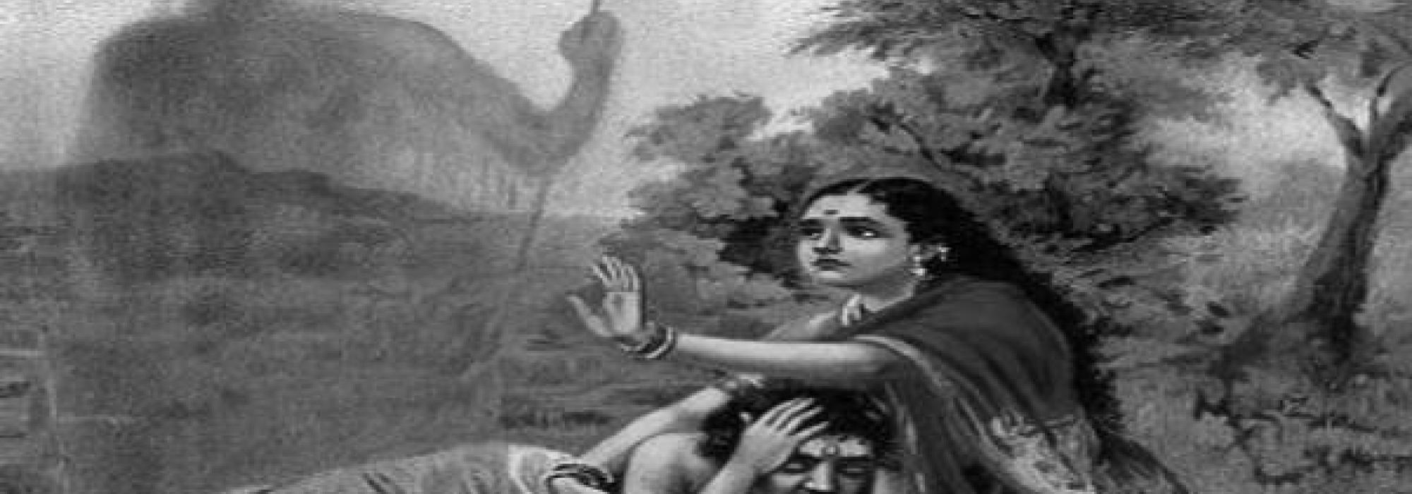The couple gathered fruits and put them together in a bundle. As Satyavān was working on the logs, his body began sweating all over. He had a tremendous headache. He immediately stopped his work, went to Sāvitrī, and said, “Sāvitrī! My limbs, head, and the entire body is aching. There is some pain in my chest too. I feels like a spear has pierced my head. I don’t seem to be keeping well. I'm not able to stand on my feet and feel like lying down.” Sāvitrī rested his head on her lap and let him spread out on the ground. She recalled Nārada’s words. In a fraction of a second, she saw someone standing by the side of Satyavān. He appeared like the dazzling sun and was of an attractive build. He wore a crown and carried a noose in his hand. His body was dark, eyes red and his entire appearance was scary. As soon as Sāvitrī saw him, she got up, after softly placing her husband’s head on the ground. Her heart was beating fast. She said with folded hands – "Svāmī! You must be a Devatā! You don’t seem to be a human. Who are you? Tell me why you are here!" He said "Sāvitrī! You are a pativratā and a tapasvinī. I will thus tell you the truth. I am Yama. The lifespan of your husband is nearing its end. I have come here to take him away with him. I will bind him with my noose and pull him away from you. He is of dhārmic conduct, is good looking, and possesses great virtues. I came here myself; I felt that it would not be fair to ask my subordinates to come here to bring him." With these words, he pulled out the thumb-sized ‘life’ out of Satyavān’s body using his noose. He tied him up and started hearding towards the South. Sāvitrī, overcome with tremendous grief followed him. Sāvitrī was a pious lady, a pativratā, and of great qualities. She was able to follow him only because of these virtues she possessed. Looking at her, Yama said, “Turn back and return to your place. You will need to perform appropriate rites for the departed being. You have followed your husband everywhere possible and you have traversed the maximum distance behind him. You have are now free of your debt to him!”