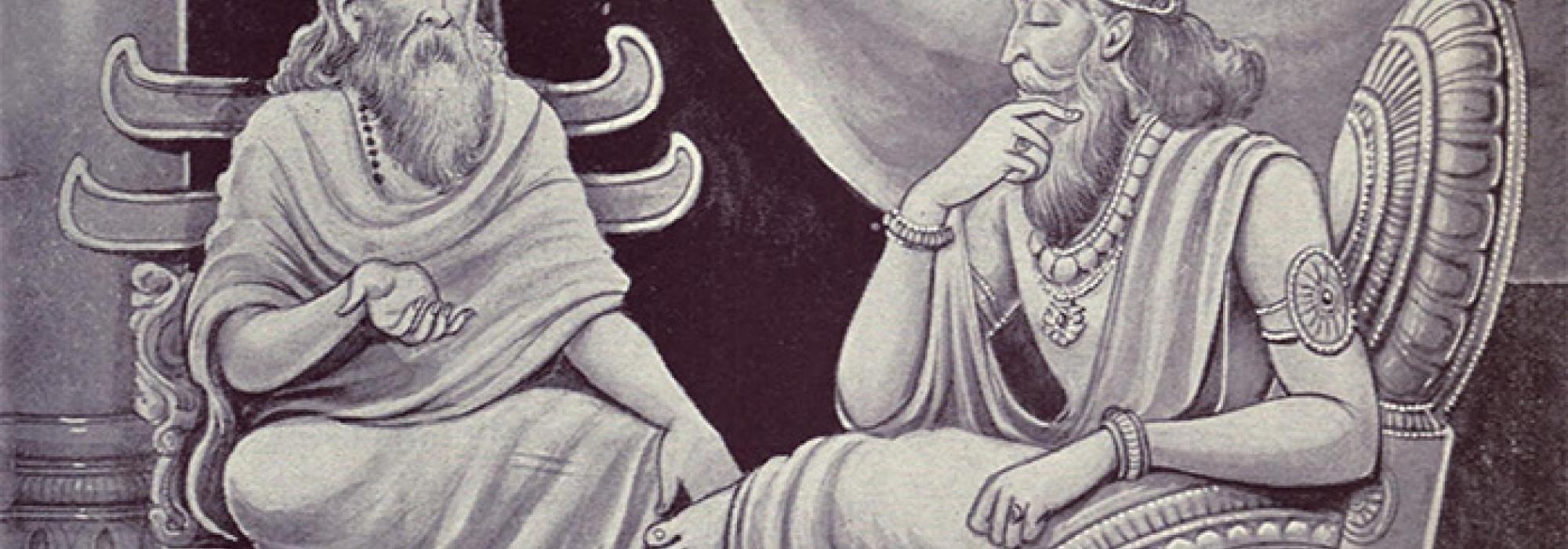 Once, an asura named Virocana and a brāhmaṇa named Sudhanva had a fight over a girl whom they wanted to marry. They tried to establish their superiority over each other. They fought and they agreed that whoever lost the fight would give up their life. They went to Prahlāda to resolve the dispute. Prahlāda was Virocana’s father but Sudhanva knew that he would not pronounce judgement in his son’s favour out of his affection for him. Prahlāda was in a fix and said, “O brāhmaṇa! He is my son and you are a brāhmaṇa; how can a person like me resolve this conflict? How do I proceed and decide what is the truth and what is false?”