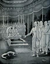 Dharmarāja went to the Himalayas with his younger bothers and gathered the ingredients required for the Aśvamedha-yāga. He also found large quantities of wealth there. He got them loaded on to the backs of elephants and camels and got his servants bring them to the capital city. Days rolled on and the day of the yāga came closer. Kṛṣṇa came to Hastinagara with his sister Subhadrā, brother Balarāma and several other Yādavas. Uttarā gave birth to a baby boy when Kṛṣṇa was in Hastināpura. Just as was expected, the baby was born dead.