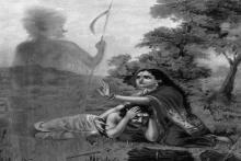 The couple gathered fruits and put them together in a bundle. As Satyavān was working on the logs, his body began sweating all over. He had a tremendous headache. He immediately stopped his work, went to Sāvitrī, and said, “Sāvitrī! My limbs, head, and the entire body is aching. There is some pain in my chest too. I feels like a spear has pierced my head. I don’t seem to be keeping well. I'm not able to stand on my feet and feel like lying down.” Sāvitrī rested his head on her lap and let him spread out on the ground. She recalled Nārada’s words.
