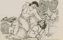 In the meantime, the other Pāṇḍavas returned home after their daily round of seeking alms. Looking at Bhīma’s face, Yudhiṣṭhira guessed that there must be something amiss and asked his mother, Kuntī, “What is it Mother? What does Bhīma want to do? Has he told you about it and got your approval?” She narrated the day’s events and said, “Bhīma has embarked upon this task only on my advice. He is going to help the brāhmaṇa’s family and also liberate the town from the clutches of the evil rākṣasa. He has undertaken a tremendous task!” Yudhiṣṭhira was not satisfied with her answer.