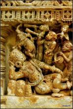 Indrajit quickly understood Rāma’s strategy. The master of illusions placed before him an illusory Sītā and pretended to kill her before his enemies’ eyes. As an enraged Hanūmān rushed at him, he noticed Sītā in Indrajit’s chariot. She looked sorrowful and her face was pale because of fasting; the lady, Rāma’s beloved, wore but a single piece of garment which was unwashed and worn out. Hanūmān observed her for a moment and concluded that she was certainly Maithilī and shed tears.