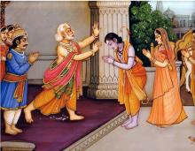 As he entered his residence, he saw Queen Kausalyā, who was clad in white silk and had spent the night observing a vow. She had performed pūjā to Bhagavān Viṣṇu early in the morning and was performing a homa in Agni. Seeing her beloved son, Kausalyā rushed to him out of joy, just as a mare runs to her foal. Rāma, out of his modest nature and respect, told her with his hands joined, “Terrible sorrow awaits you, Sītā, and Lakṣmaṇa. I shall live in the uninhabited forest for fourteen years subsisting on honey, roots, and fruits like a muni.