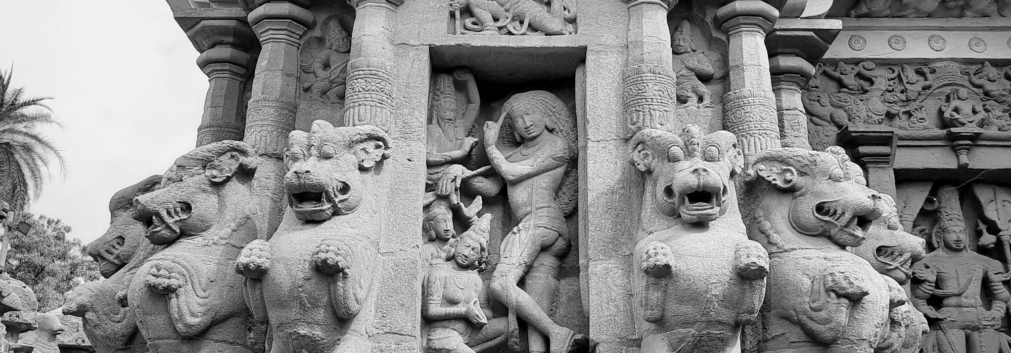 The master may be an ascetic, but does that necessarily imply that his retinue is detached and meditative as well? Not quite so! The poet brings a contrast in the āhārya of Śiva and his gaṇas, only to reflect the contrast in their mental landscapes – Śiva the epitome of serenity and stability, the gaṇas – metaphors for fickleness and worldly pleasures. In 1.55, the poet describes that the attenders had decked their ears with the flowers of the Namerus trees, clad in soft barks of birch trees, seated themselves comfortably on stones coated with fragrant resins and had coated themselves with the pigments of manaḥśilās. The gaṇas are indeed provide themselves with luxurious āhārya with whatever is available at the height of the himālayas. Nandi too could not tolerate the roar of the lions, and tried conquering them by bellowing out louder than their combined roar. While Nandi’s conquest is of the outer world and is ephemeral, Śiva’s is of the inner realm.