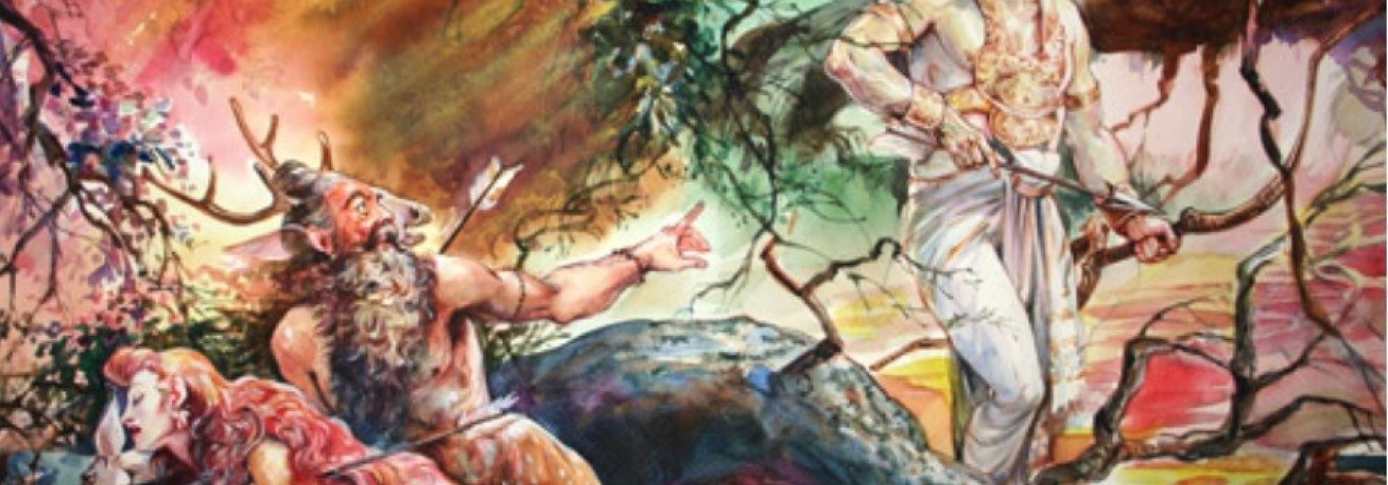 Pāṇḍu shooting arrows at the deer couple, who transform into humans is a masterpiece. The deer are subtly shown in their intimate position, while they slowly transform into humans. The artiste uses a common eye to suggest the eye of the deer and of the ṛṣi Kindama. His upper body is human which enables him to utter a curse. Pāṇḍu is perplexed and stands stupefied. (See the cover images). In another painting, Pāṇḍu, who is overcome by lust is seen hugging Mādrī who is decked in spring colours. Pāṇḍu's pale body and his eyes, which almost look lifeless, betray the impending calamity.