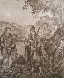 [1] Vaiṣampāyana started off by recounting tales of the ancestors and descendants of Bharata. In the Bharatavaṃśa, there was a rājaṛṣi named Pratīpa who spent years meditating at the source of the Gaṅgā. Once the river took the form of a gorgeous woman and approached the rājaṛṣi and sat down on his right thigh. Seeing this beautiful maiden, Pratīpa asked her what she desired. She wanted to marry him but he was adhering to a strict vow of fidelity. The damsel begged for his love but he gently refused her advances, telling her that she could become his daughter-in-law instead. Moreover, she had seated herself on his right thigh, meant for daughters and daughters-in-law. (The left thigh is for wives and lovers) She accepted his words and told him that she would wed his son. She cautioned him that his son won’t be able to judge the correctness of her actions, and so should not question her.