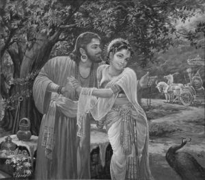 When Kṛṣṇa learnt that Arjuna was visiting Prabhāsapura, he went to meet him and enquired after his welfare. Kṛṣṇa then took Arjuna to the Raivataka mountain. As per Kṛṣṇa’s orders, it had already been decorated. They took their snacks and meals on the mountain; then they watched dramas and dance recitals. At night, having comfortably lain down on beautiful beds, Arjuna described to Kṛṣṇa all the details of his travels to rivers, mountains, and tīrthakṣetras before falling asleep. In the morning, he woke up to melodious music, the sounds of the vīnā, and divine stotras. After performing his daily ablutions, he went along with Kṛṣṇa to Dvāraka, riding a golden chariot. The entire city had been decorated to welcome Arjuna; thousands of townspeople had gathered on the royal road in order to catch a glimpse of him; the chiefs of the Bhoja, Vṛṣṇi, and Andhaka clans came to greet him. Arjuna bowed down to all the elders and took their blessings; he embraced his equals; he blessed all those younger to him; he stayed in the comforts of Kṛṣṇa’s house. A few days later, there was a grand festival held on the Raivataka mountain; it was jointly organized by the Vṛṣṇis and the Andhakas. All over the place one could find maṇṭapas, lamp-trees, musical instruments, music, drama, dance – only this! People from different places came there along with their children, some on a variety of chariots while others came on foot. Several prominent people among the Yādavas were present – Balarāma, Revatī, Akrūra, Sātyaki, and others. Kṛṣṇa and Arjuna went together to participate in this festival; there, Arjuna saw, walking amidst her friends, Subhadrā; he lost his heart to her. Seeing this, Kṛṣṇa said with a smile, “What’s this – a forest-dwelling nomad being tormented by lust? She is my sister; born to the same womb as Balarāma; if you love her, tell me; I shall bring it up before my father.” Arjuna said, “Kṛṣṇa, what are you saying! If your sister becomes my queen, then I will get everything that is auspicious! What should I do to win her hand, tell me; I will do everything that is humanly possible!” Vāsudeva said, “Arjuna! The established practice among kṣatriyas is svayaṃvara; but we can’t be sure that it will work out the way we want; the wise tell us that it is within the framework of dharma for a kṣatriya to abduct a maiden and marry her. Therefore, you kidnap my sister and escape from here! Who knows what might happen in a svayaṃvara?” After that, Krsna and Arjuna sat together and planned the execution of their idea. They sent their plans to Indraprastha through a speedy messenger, who would pass this information on to Dharmarāja. He gave his consent.