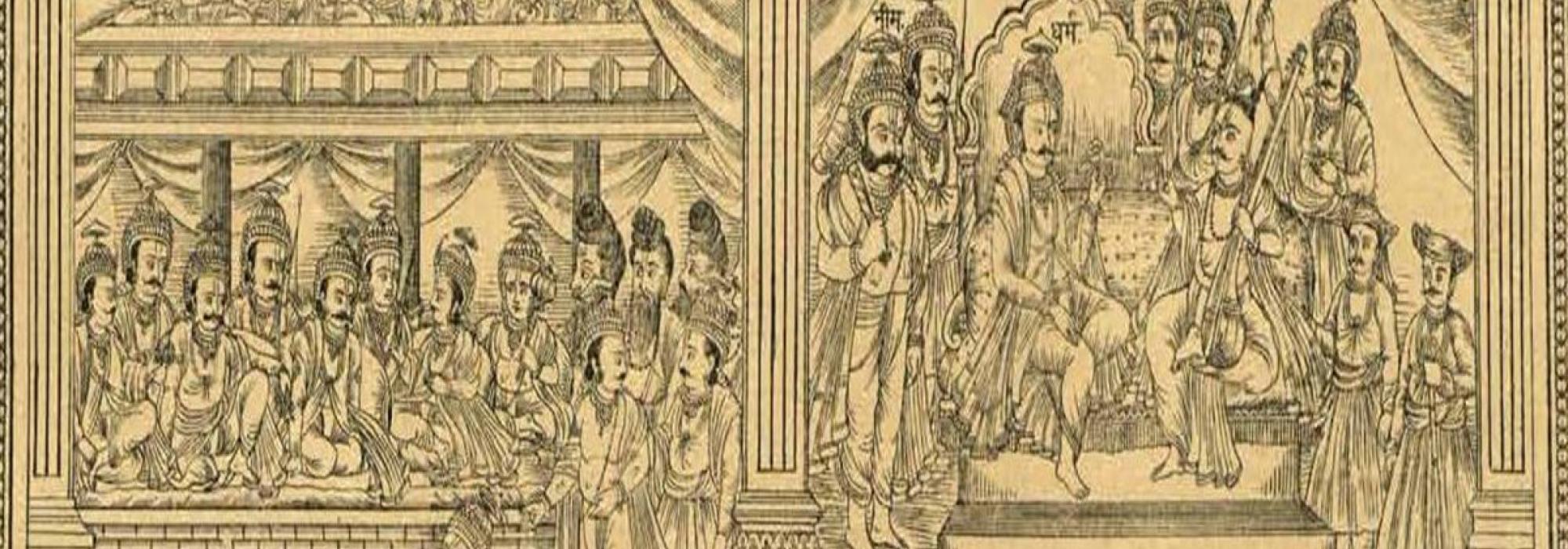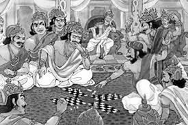 Listening to this Śakuni replied, “Why must you hesitate, Yudhiṣṭhira? One who knows the game and is skilled at it is a smart player; he will be sportive and will stay calm; he will win both the game and the gamble. We’ve been doing this all our lives; don’t worry, come let us play. Tell us what you’ll pledge first; don’t delay!” Yudhiṣṭhira replied, “It’s a great sin to gamble with cunning opponents! One must win a war and a game only by adhering to dharma. Great souls never utter a lie; they neither cheat nor win by deceit. I do not wish to gain pleasure by gambling; I don’t desire to gain more wealth either. Even if gambling is allowed by law it isn’t something to be revered!” Śakuni said, “Yudhiṣṭhira! Doesn’t a brāhmaṇa try to win over another through debates; doesn’t one scholar try to defeat another? No one considers that cheating. If you still think that I’m a cheat and if you are scared to play, you may go back!” Unwilling to compromise, Yudhiṣṭhira said “I will not look back once called for a game and that is my vow. Fate is all powerful; I surrender to Fate! Let us begin! Who should I play with?” Duryodhana came forward and said, “I shall pledge my wealth and all the precious gems. My uncle Śakuni will play on my behalf.” Yudhiṣṭhira said, “The rule of the game doesn’t allow someone else playing in the place of the one who’s betting; you know the game better. If you are agreeable to this adjustment, let us go ahead!” Once everything was fixed in this manner, Dhṛtarāṣṭra came along with the other kings and with Bhīṣma, Droṇa, Kṛpa, and Vidura to the assembly hall and sat on their thrones. The game started. Yudhiṣṭhira said, “Here, I pledge this ornament studded with precious stones. What about you, Duryodhana?” Duryodhana replied with pride, “I too have several precious stones and a lot of wealth. I’m going to win in this turn!” Śakuni rolled the dice and declared, “Here! I won!” Yudhiṣṭhira said, “Śakuni! You’ve won by cheating! Let us now pledge in thousands! I pledge a hundred chests with a thousand gold coins in each!” Śakuni rolled the dice again and declared, “Look here, we won again!” Yudhiṣṭhira then pledged the chariot and the eight horses that he had driven to reach Hastināpura. Śakuni won them too. Yudhiṣṭhira then pledged elephants, dāsis, servants, chariots, horses, soldiers – each in thousands and treasure chests filled with loads of precious gems. Śakuni won them all turn by turn. Vidura then told Dhṛtarāṣṭra, “Revered king! Listen to my words. Just as medicine is not relished by a person on his death bed, you might not like this. On his birth, Duryodhana screamed like a jackal. He is born to destroy the lineage of the Bharatas. Though you are aware that he is like a jackal in your family, you have not taken any measures to bring him under control. A person who collects honey from a beehive has all his attention on the hive and not on the pit below it. Similarly, Duryodhana’s eyes are on the riches he is getting out of this gamble and he is oblivious to the enmity he is going to develop with powerful warriors. You are aware how Asamañjasa and Kaṃsa were excommunicated from the kingdom by the citizens, which helped them live in peace. Similarly, make Arjuna bring Suyodhana under control. Bringing him under control will grant peace to the Kauravas. Sacrifice your crow and gain a peacock. Give away your fox and get a tiger in return. Don’t get immersed in an ocean of sorrow. One must be ready to give up a man for the sake of a family; a family can be sacrificed for the well being of a village; a village can be done away with if it will cause welfare to the nation; for one’s own good, the earth might have to be given up. You might know the story of a greedy person who killed the birds which laid the golden eggs. He was desirous of procuring all the eggs at once and killed them all, to no avail. Don’t cheat the Pāṇḍavas out of your desire for wealth. You will need to repent later, just like the man who killed all those birds. Just as a flower vendor picks up flowers