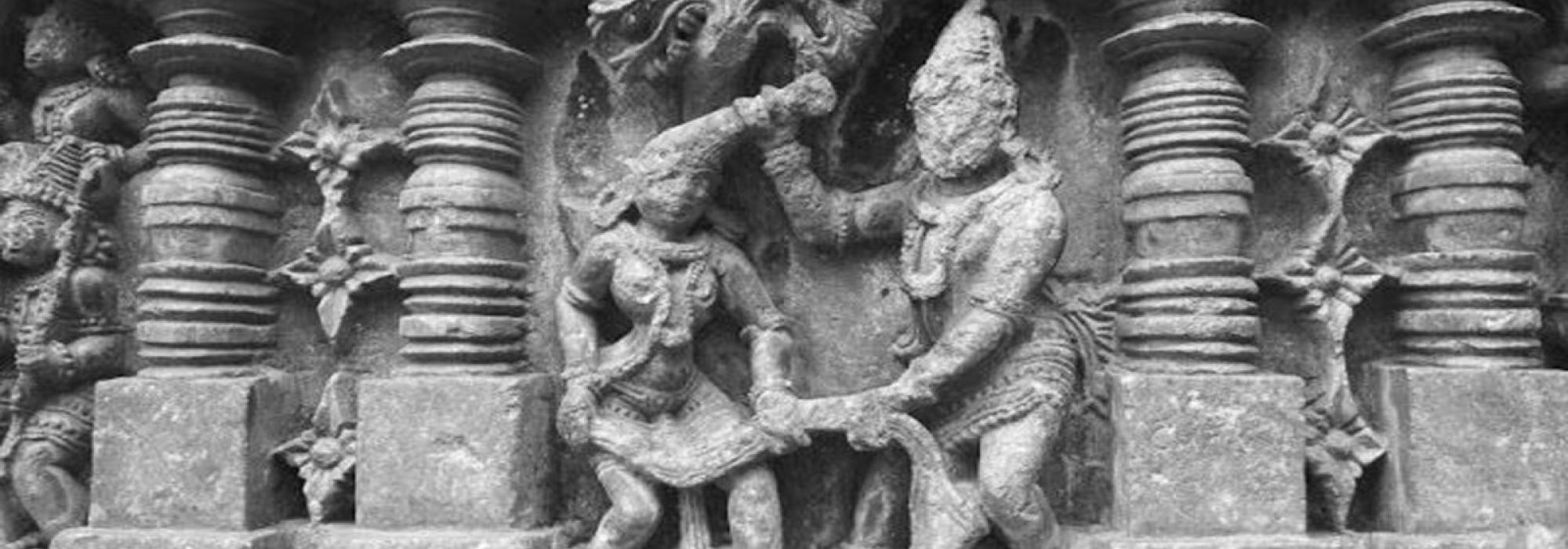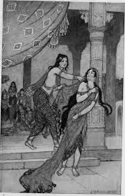 Draupadī said, “What are you speaking, Pratikāmī! How can someone pledge his wife in a gamble? Yudhiṣṭhira had lost his mind while gambling but did he not have anything else to pledge?” Pratikāmī said, “Yes, he was left with nothing and this is the reason he put you to gamble! He had lost his brothers and himself by then! He then lost you too.” Draupadī said, “Pratikāmī! Go to the assembly and ask those gamblers – did he lose me first or did he lose himself? You may then take me!” He went to Dharmarāja and questioned him. Dharmarāja sat as though he had lost his breath. He did not speak for or against the matter. Duryodhana then said, “Let Pāñcālī come here and ask him! Everyone else here will hear her question and his reply too!” Accordingly, Pratikāmī went back in distress and said, “Oh revered lady! The gamblers want you to come there! Seems like Kauravas are close to destruction; it does not seem like they have any concern for your dignity – they don’t care if it puts your nobility to a shame there!” Draupadī said, “Difficulties befall the fool and the learned alike. He should experience both. Such is fate and the divine acts. Dharma is the greatest of all on earth. Protecting Dharma will bring peace.” In the mean time, Duryodhana sent a messenger to Draupadī. As she was in her menses, Draupadī wore only a single piece of garment. She came weeping in the single raiment she wore and stood before Dhṛtarāṣṭra in the assembly. Looking at her, Duryodhana said, “Pratikāmī! Bring her here; let her listen to what the Kauravas say!” Pratikāmī was in a fix; he could not disobey Duryodhana’s words, but at the same time, he was worried that Draupadī would get enraged. Confused, he asked, “What should I tell Kṛṣṇā?” Duryodhana could not stand this. He called Duśśāsana and said, “This son of a sūta is timid and seems to fear Bhīma. Go, drag her and bring her here. What can the Pāṇḍavas do to you even if they are angry?” The next moment, Duśśāsana went to her and said, “Come Pāñcālī, come! We have won you! Don’t feel shy – look at Duryodhana! Serve the Kauravas; we have righteously won you. Come to the assembly!” Draupadī was in great distress; she turned pale and was sweating. She wiped her face with her hands and ran towards the quarters where Dhṛtarāṣṭra’s queens stayed. Duśśāsana roared and rushed after her. She held her by her long hair that was like a black snake. Duśśāsana held the long tresses that were sanctified in the Rājasūya-yāga. It seemed as though the valour of the Pāṇḍavas was defeated. He pulled her to the assembly, treating her like a lady orphaned by her husband. Draupadī said in a voice full of pain, “You brute! I am impure today and I’m wearing a single garment. I cannot come to the assembly!” Even after listening to her words, he exerted great force on her tresses and said “Your purity or your garments don’t matter to us! You have been won over in the gamble; you are now our dāsī! Dāsīs should always be available to us!” Her hair got dishevelled in this fight and her garment slipped. In such a state, an embarrassed Draupadī said with rage, “Everyone assembled here is well-versed in the śāstras. Elders, gurus, and learned men are here; I cannot stand in their presence in my current state. Even if the demigods come to your support along with Indra, the Pāṇḍavas won’t spare them. It appears to me that the lineage of Bharata has lost its ethics and its kṣatriya-dharma!” with these words, Draupadī looked at the Pāṇḍavas with sorrowful eyes. The Pāṇḍavas, who were fuming with rage now started to burn with fury. Her look caused them such intense pain that they had never felt before – not while giving away all their wealth or their kingdom. Draupadī looked at her helpless husbands, who seemed to be lifeless.