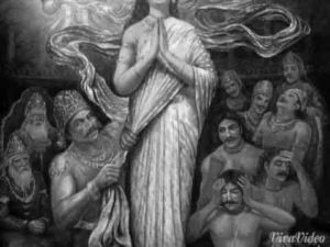 There was an endless manifestation of Draupadī’s sarees and Duśśāsana got tried to trying to disrobe her. He felt humiliated as his efforts turned out to be futile. There was a heap of sarees fallen in the court. Everyone rebuked him and appreciated Bhīma. They criticised the Kauravas for not answering the questions Draupadī had posed and disapproved of Dhṛtarāṣṭra’s behaviour. The wise Vidura stood up, waved his hands trying to bring the court under control and said, “Dear all! Draupadī is crying like an orphan and is seeking help. No one is caring to reply to her questions under the current circumstances. These are questions of dharma and the way of dharma is subtle. It is the duty of the court to provide justice and take care of the needy. When a question related to dharma is posed, people in power should answer it without getting carried away by emotion. They should answer the question in an unbiased manner without being subject to lust, greed, and anger. Vikarṇa said whatever he felt was right. You all may feel free to speak your mind too, just as he did. If people who know dharma remain silent, it is as good as telling a half-life. If your answers sound irresponsible, it is as good as speaking an absolute lie. Please give suitable answers to the questions Draupadī has posed!” And yet, no one replied. Draupadī addressed the gathering, “Look! My salutations to this assembly! I should have done this long back. As the wretched fellow was dragging me with force, I was unable to offer my salutations before.” With these words, she collapsed on the floor in sorrow. She cried uncontrollably. “No one else other than the kings who had come for my svayaṃvara had seen me. When I was at home, even the Sun and the Wind had not seen me. Now I’m standing here in the middle of this assembly, helpless. The Pāṇḍavas could not tolerate it even if a wind blew past me. But now they remain silent even as they see me getting dragged by the evil one. The Kauravas are quiet while their daughter-in-law is suffering. This is certainly due to the play of Time. What can be more pitiable than a noble lady like me standing here in the court? Where has the dharma of kings vanished? I am the wife of the Pāṇḍavas, the sister of Dhṛṣṭadyumna, and friend of Vāsudeva – should I be dragged into the court? Kauravas! You decide and tell me – am I a dāsī or not. I shall act as per your word. This wretched fellow is pulling my garment. I will not be able to put up with it for long!”