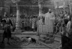 Duśśāsana pulled Draupadī’s garment and taunted her in vulgar language, even as she lamented, looking helplessly at the pale faces of her husbands. Her garment was dropping off her shoulder. Looking at this, Bhīma was greatly pained and told Dharmarāja in a furious tone, “O King! Gamblers never go to the extent of pledging their servants out of compassion for them. The Kauravas, through deception, have won over everything that was in our possession – the treasures that the king of Kāśi had offered to us as a sign of respect, our chariots, our weapons, and the entire kingdom. They haven’t spared even you and your brothers. None of this angers me because you are the lord of all. But it was not right to pledge Draupadī in the game of dice. She does not deserve such treatment at all. Having married the Pāṇḍavas she is undergoing so much of pain. Why should she be subject to humiliation at the hands of the Kauravas? This has enraged me and I’m terribly angry with you. Sahadeva! Get some fire. Let us burn both his hands!”
