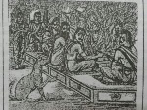 The following is the summary of the episode: While Janamejaya, Parikṣit’s son, along with his brothers Śrutasena, Ugrasena and Bhīmasena was performing a dīrgha-satra (an elaborate yāga), a stray puppy appears. Janamejaya’s brothers chase it away. It goes to its mother Saramā and complains. Saramā was a female dog from the heavens. For having harassed her innocent pup, she cursed them that a hitherto unseen fear would get the better of them. Having completed the satra, Janamejaya returns to Hastināpura and appoints the seer Somaśrava as his purohita (royal preceptor). He was born to a female snake. His life’s vow was that he would never refuse the request of a brāhmaṇa. Promising him that he would support him in the observance of his vow, Janamejaya appointed him. Thereafter the king conquered Takṣaśila, the abode of the serpents.