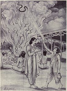 The king Parikṣit who has gone hunting encounters a seer in silent meditation, whom he interrogates regarding the whereabouts of the deer that he had just shot. The seer remains mute. The enraged king, with mischievous intent, garlands the seer with a dead snake. Śṛṅgi, the son of seer Śamīka, who happens to come there, notices this prank and curses King Parikṣit to die of a snake-bite. The curse finds its fulfillment in Parikṣit’s death due to a snake-bite. To avenge his father’s death, Janamejaya vows to eliminate the entire serpentine species and undertakes the sarpa-yāga. While the yāga was in progress, Āstīka—the son of the serpent-king Vāsuki’s sister—comes to Janamejaya, praises him and his undertaking of the yāga, gains his confidence, and requests him to stop the yāga. King Janamejaya, who was well-versed in dharma, knew that it was only correct to fulfill the wish of a brāhmaṇa while a yāga was in progress; accordingly he acquiesces to Āstīka’s request and stops the sarpa-yāga. Delighted, Āstīka goes away.