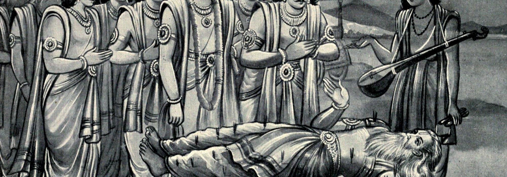 In response, Kṛṣṇa said, "I was thinking about Bhīṣma, who is lying on a bed of arrows; he is fading away like a fire on the verge of being extinguished. Yudhiṣṭhira! Born to Gaṅgā herself, becoming a disciple of Vasiṣṭha and learning the Vedas in a methodical manner with all its auxiliary sciences, and learning the martial arts from Paraśurāma to whom he was a dear student, Bhīṣma is indeed a great soul who knows about past, present, and future; I was thinking about him. If he dies, the world would become dark like a night without the moon. Yudhiṣṭhira! Therefore, when he is alive, go to him and learn from him all those things you desire to know, about a variety of topics like rāja-dharma and so forth!" Dharmarāja's eyes were filled with tears. “You also come with me! We shall go at once.” Kṛṣṇa agreed and both of them went to meet Bhīṣma.