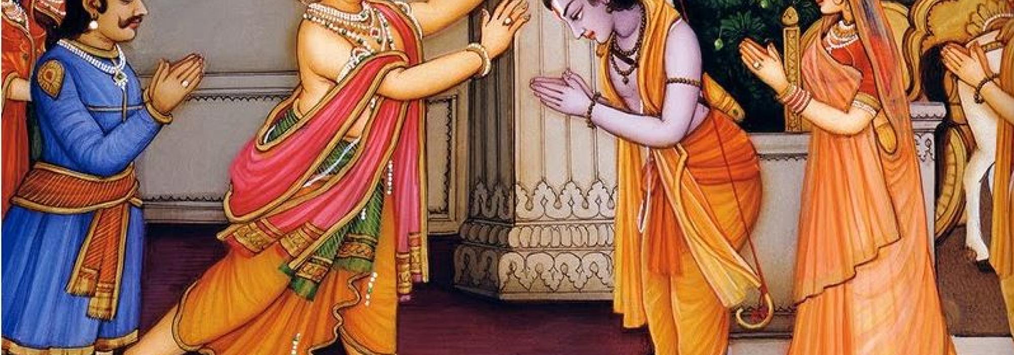 Rāma, Sītā, and Lakṣmaṇa performed pradakṣiṇa to Daśaratha. Rāma and Sītā touched the feet of Kausalyā and Lakṣmaṇa of Sumitrā. Just before they left, Sumitrā advised Lakṣmaṇa, “Look upon Rāma as Daśaratha, Jānakī as me, and the forest as Ayodhyā. Farewell, my child, be happy!”