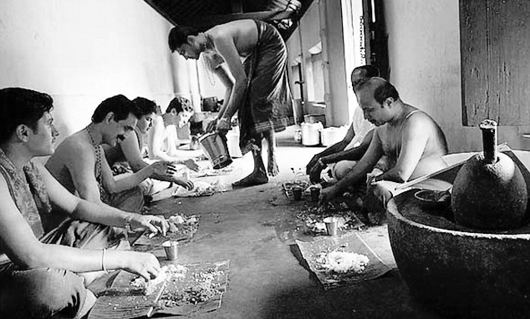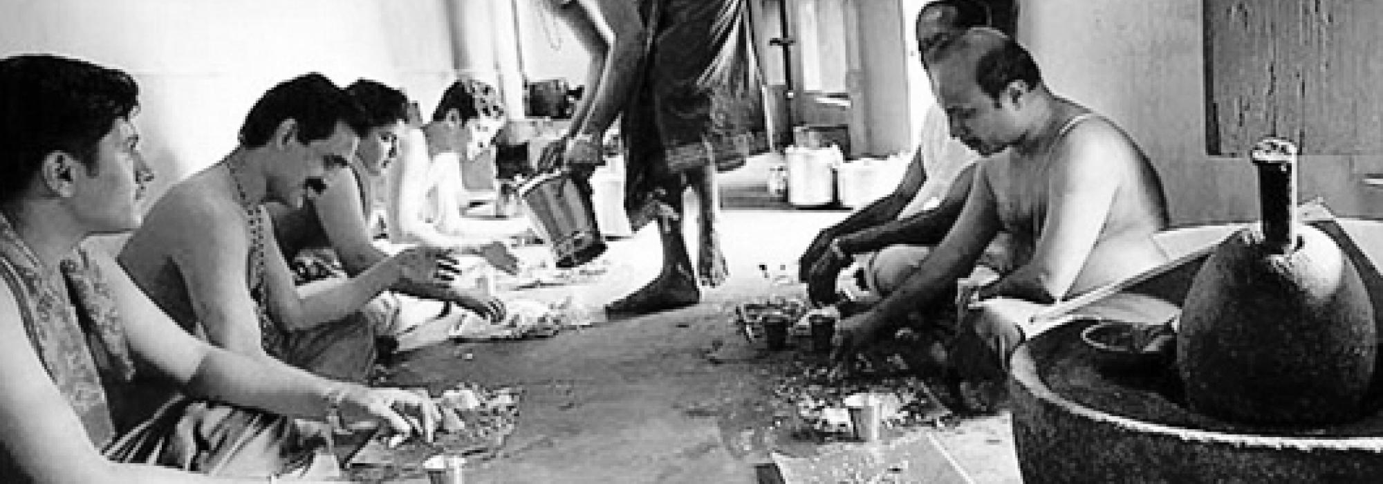 Maṅgaleśvara-śāstri once went on a pilgrimage to Puri to see the deity Jagannātha. When he sat down for a meal in the temple at Puri, he was not given a plantain leaf to eat on. He picked a few leaves from a nearby banyan tree, and fashioned a plate by tacking them together. Seeing this, the local Brahmins (known as the ‘Gouda Brahmins’), who were waiting to be served on the traditional plantain leaves, created a ruckus. Śāstri was surprised and asked what the fuss was all about. They answered disapprovingly, ‘Is it right to desanctify Śrī Nārāyaṇa’s bed by eating upon it?’ Śāstri’s witty mind spontaneously came up with the above śloka: