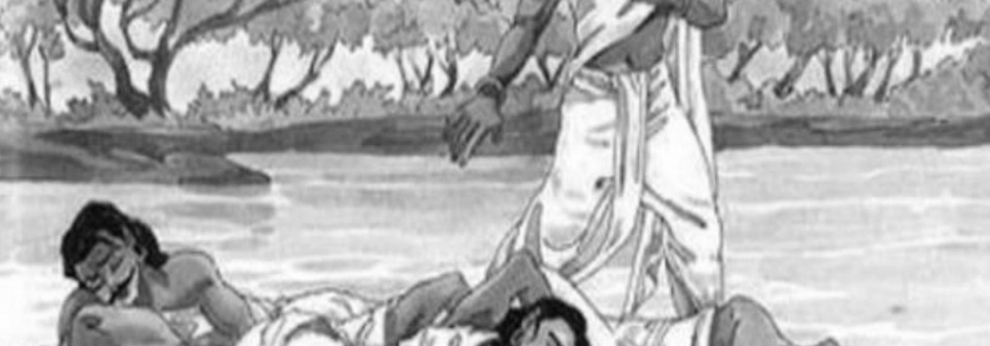 Tired, disheartened, and affected by thirst, they approached a banyan tree and spent some quiet moments resting in the cool shade. Nakula climbed the tree and looked for a source of water; finding one, he went in that direction with empty quivers to fill up water. He approached a crystal lake. It was inhabited by cranes. He wished to drink some water to quench his parched throat when he suddenly heard a voice from the sky – “O child, do not commit this rash act! This lake belongs to me. First answer my questions; then drink the water and take away as much as you need.” Nakula was extremely thirsty and he proceeded to drink the cool water, disregarding the faceless voice. The moment the water touched his lips, he dropped down dead.